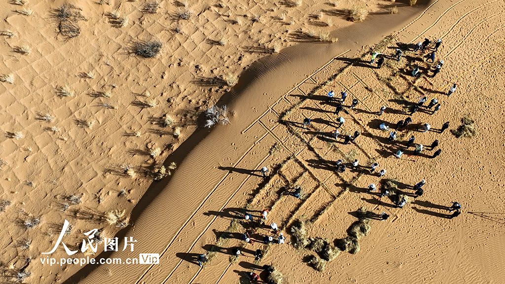 2024年4月10日,甘肃省张掖市临泽县北部荒漠防沙治沙区,河西学院的大学生们在林草工作人员的指导下进行用麦草压沙障。