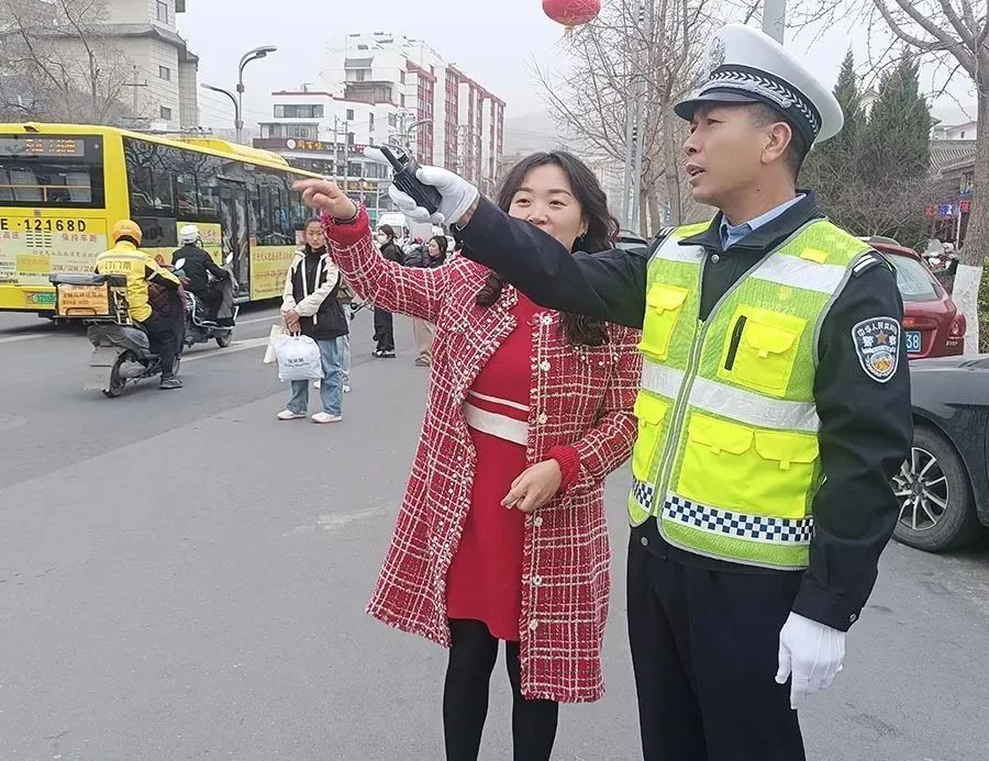 △天水市公安局秦州分局城区交警大队民警给游客指路。