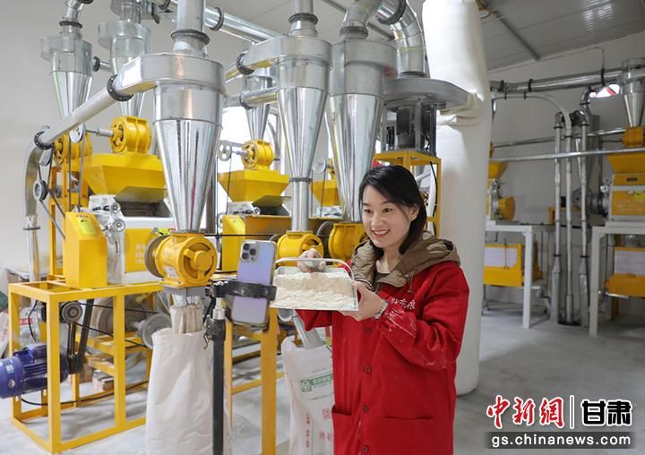 4月10日,环县电商主播在荞麦面加工厂房直播带货。乔洁 摄