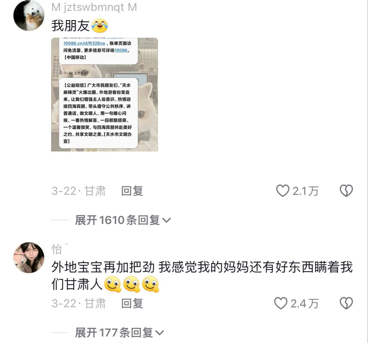 网友@花月星:给我一个外地人看哭了,去过哈尔滨,去过淄博,去过天水,但天水的一切让我热泪盈眶。