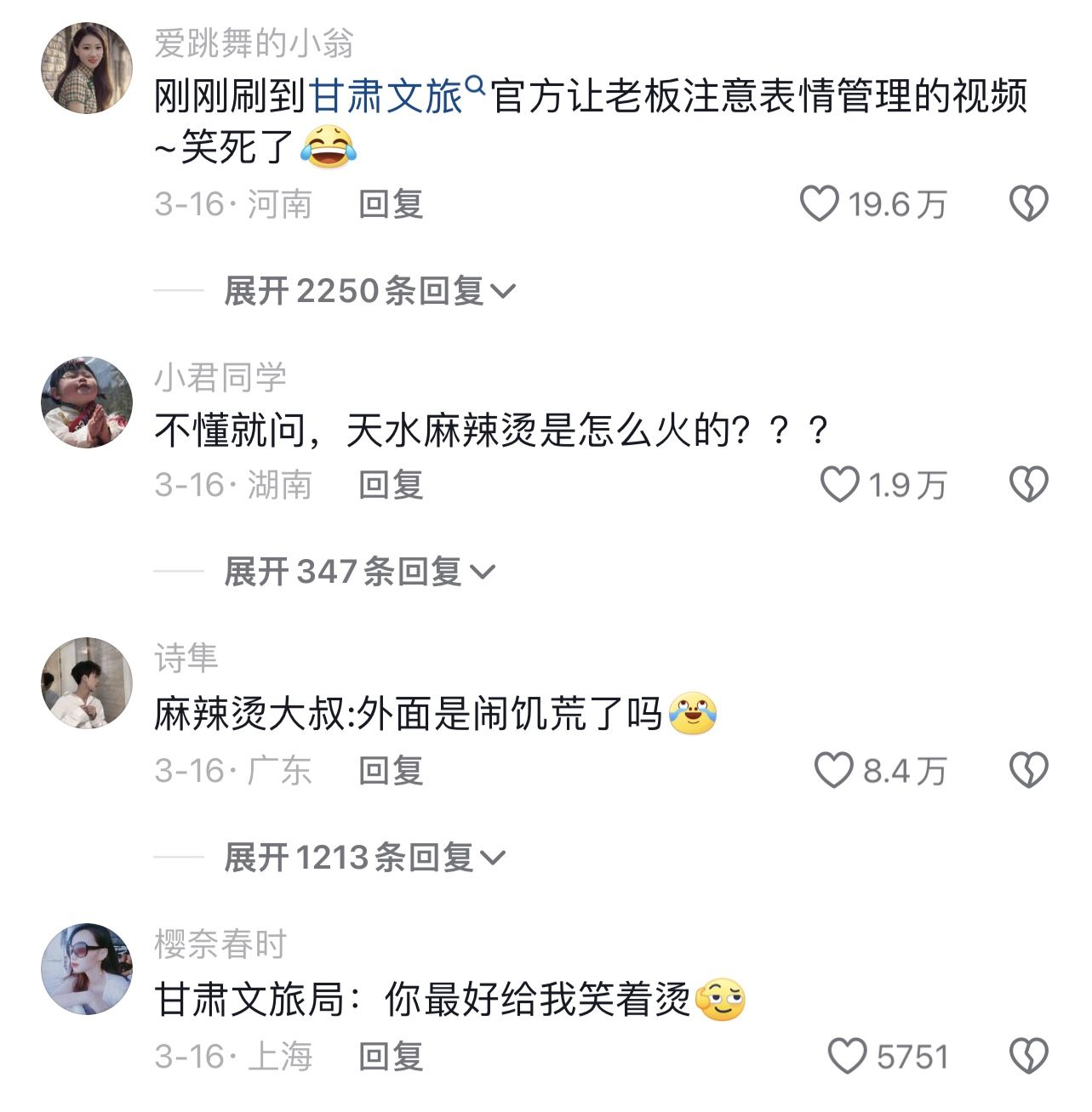 “烫不完,根本烫不完!”麻辣烫老板忙出“痛苦面具”,直到甘肃文旅在网上提醒“注意表情管理”,麻辣烫大叔看到之后第二天立马展现招牌甜美笑容,并感叹“高兴滴很!”