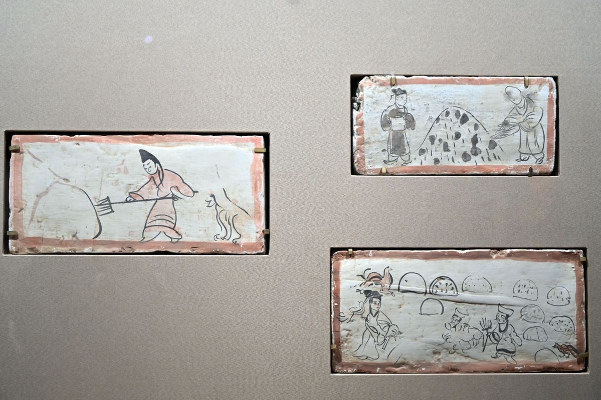 张掖市高台县博物馆内展出的彩绘壁画砖。