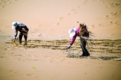 在内蒙古库布其沙漠,治沙工人铺设沙障。新华社发