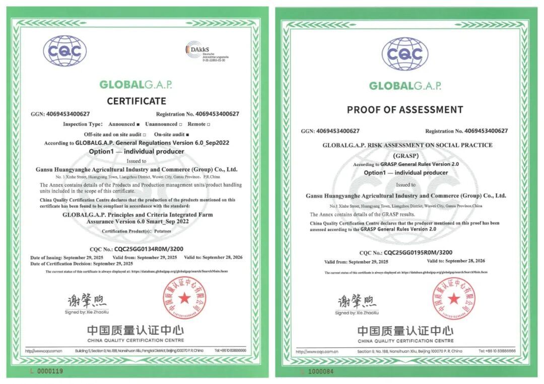 近日,甘肃农垦集团黄羊河农场马铃薯产业再添“国际名片”,成功通过中国质量认证中心审核,斩获全球良好农业规范认证证书及社会实践风险评估证明,成为国内马铃薯产业标准化生产的示范企业,标志着我省马铃薯产业生产管理水平迈入国际先进行列。
