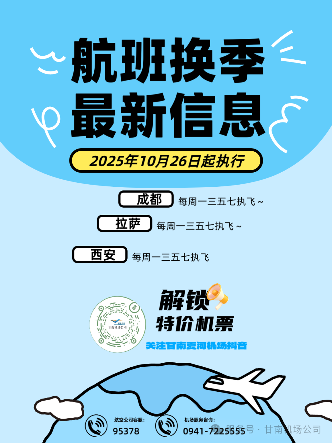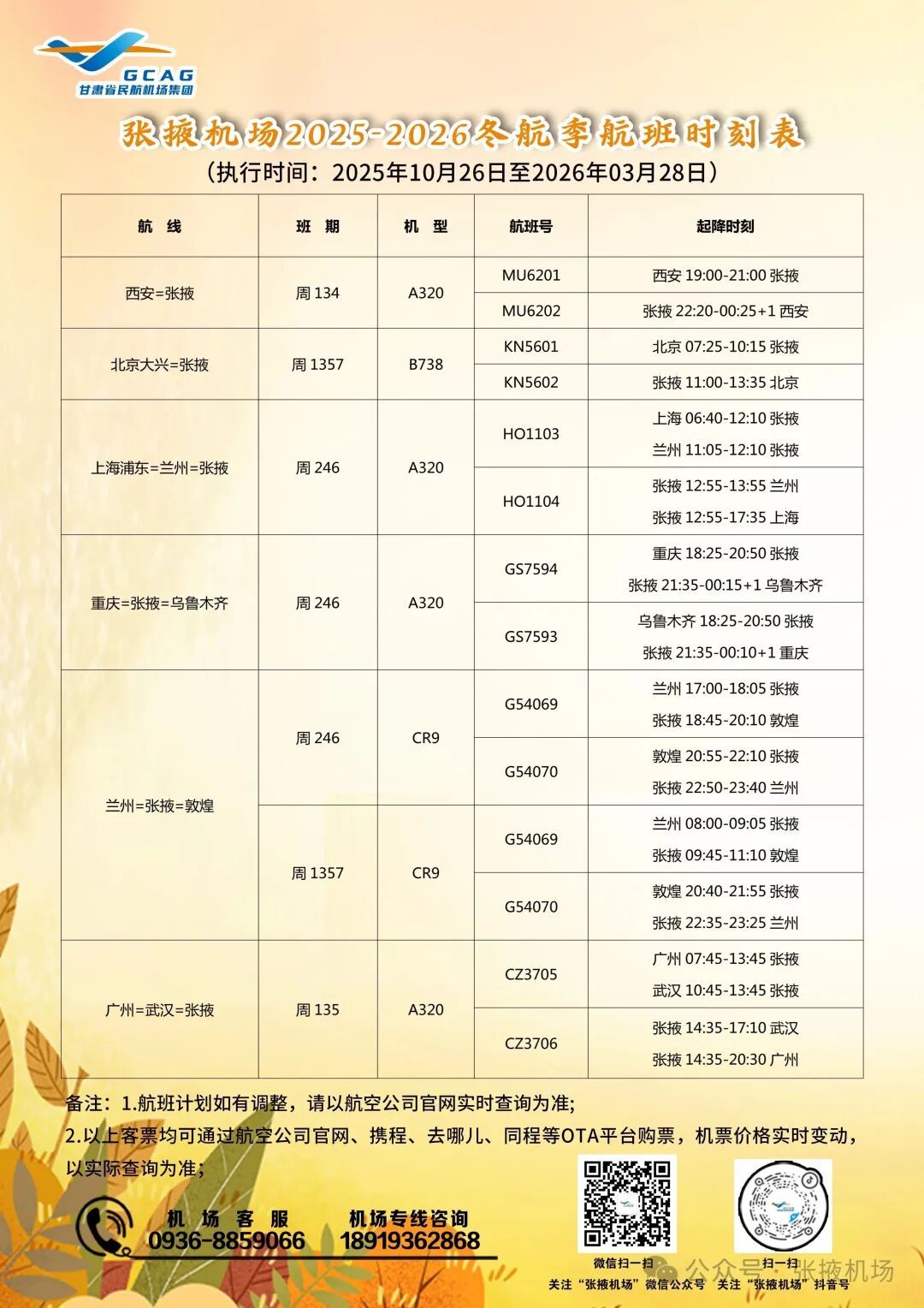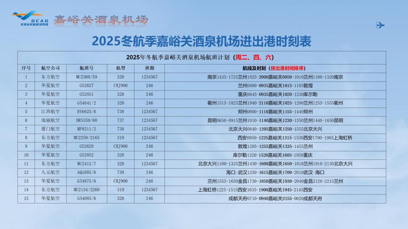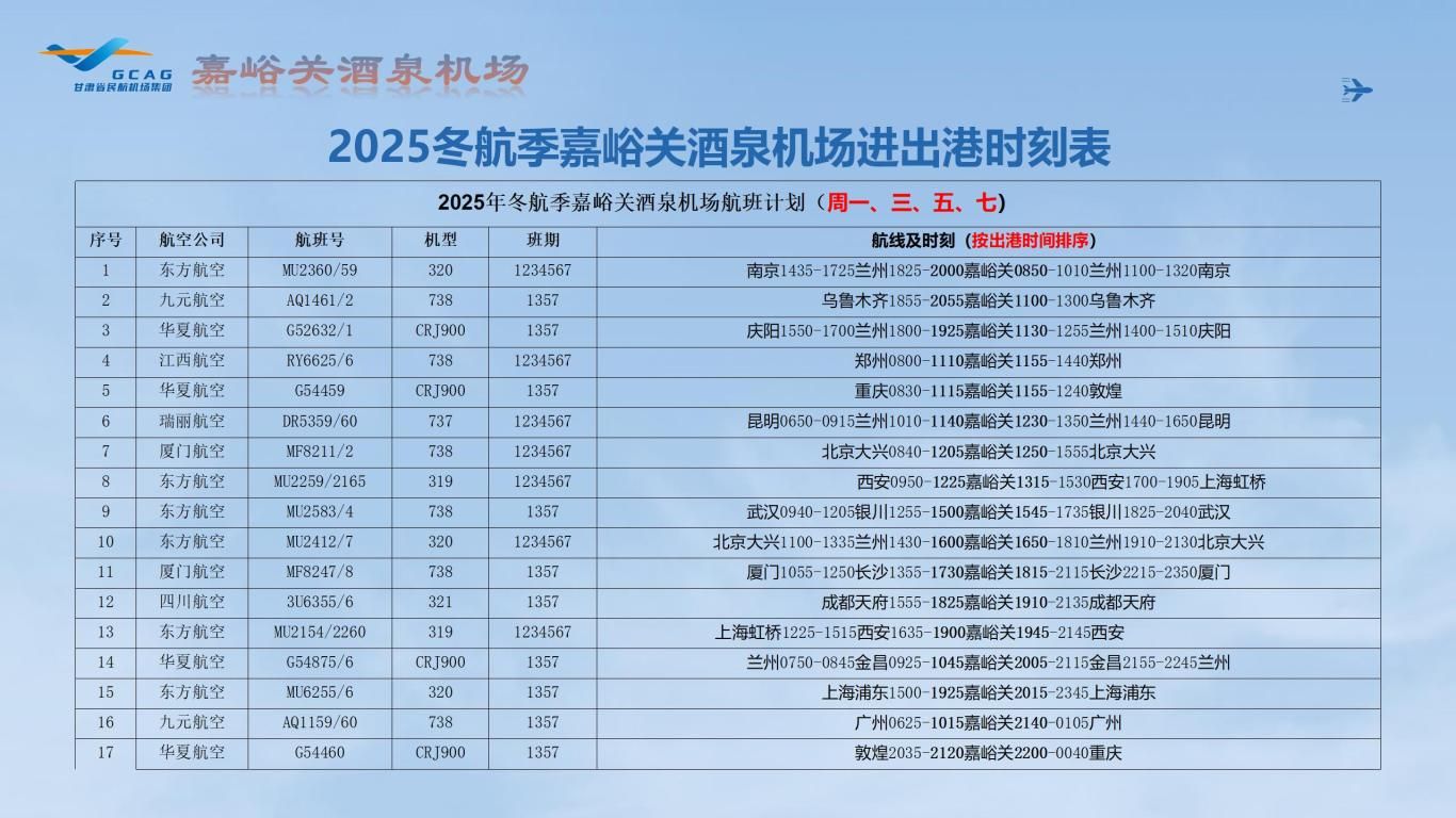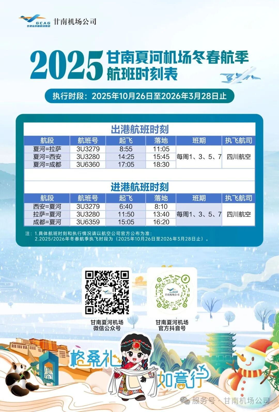 甘肃省民航机场集团所辖各机场2025年10月26日至2026年3月28日执行冬航季航线航班。